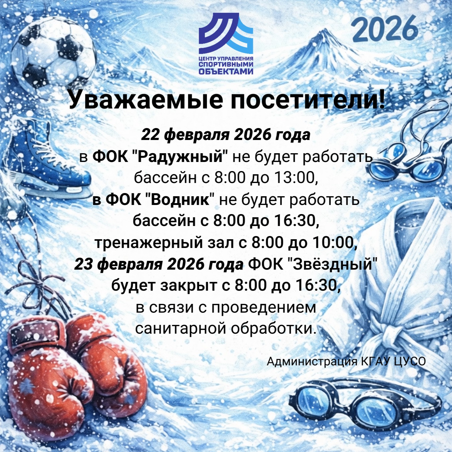 7 февраля 2026 года в плавательном бассейне физкультурно-оздоровительного комплекса «ВОДНИК» прошли соревнования по плаванию Первенство КГАУ ЦУСО «День спиниста». В них приняли участие 24 спортсмена из структурного подразделения по спортивной подготовки отделения «плавание». Программа соревнований Читать дальше…